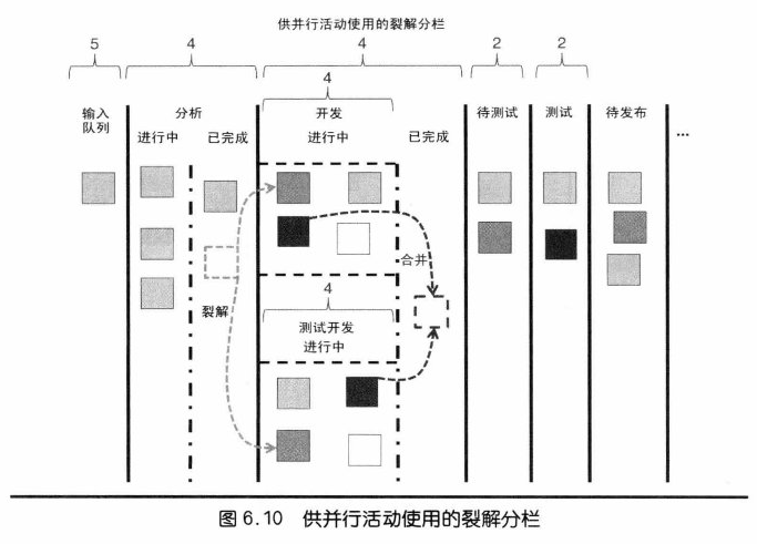 有時候一個過程可能會同時存在兩個以上的開發活動同時存在,例如:UI 程式功能與美術製作。可以額外拆個分欄來可視化流動(或者極端一點把卡片撕成兩半,然後在最後拼起來)。